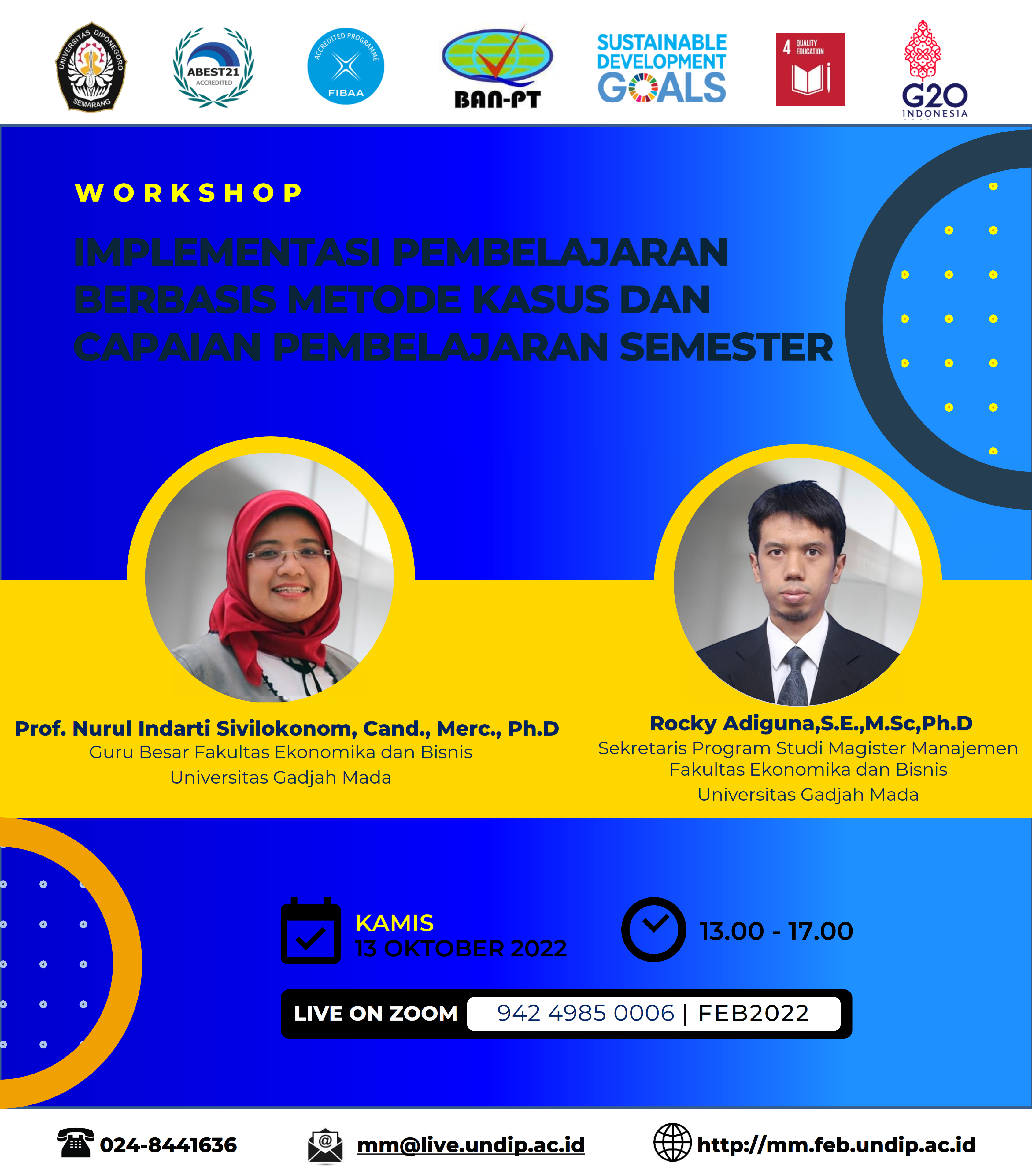 Pada tanggal 13 Oktober 2022 Program Studi Magister Manajemen Fakultas Ekonomika dan Bisnis Universitas Diponegoro (MM FEB UNDIP) mengadakan workshop “Implementasi Pembelajaran Berbasis Metode Kasus dan Capaian Pembelajaran Semester” secara online melalui Zoom meeting. Narasumber acara ini yaitu Prof. Nurul Indarti Sivilokonom, Cand., Merc., Ph.D Guru Besar FEB UGM dan Rocky Adiguna, S.E., M.Sc., Ph.D. Sekretaris MM FEB UGM.