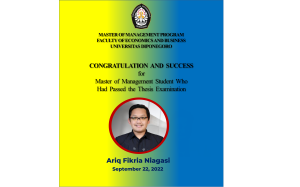 Ariq Fikria Niagasi Congratulation and success to Ariq Fikria Niagasi, the student of Master of Management Program Faculty of Economics and Business Universitas Diponegoro who had passed Thesis
